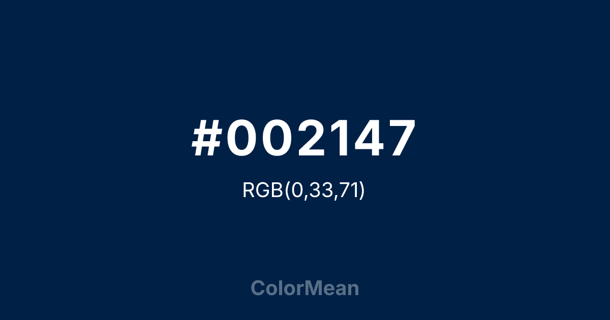Convert Oxford Blue (#002147) across different color models and formats. These conversions help designers work seamlessly between digital and print media, ensuring this color maintains its intended appearance across RGB screens, CMYK printers, and HSL color manipulations.