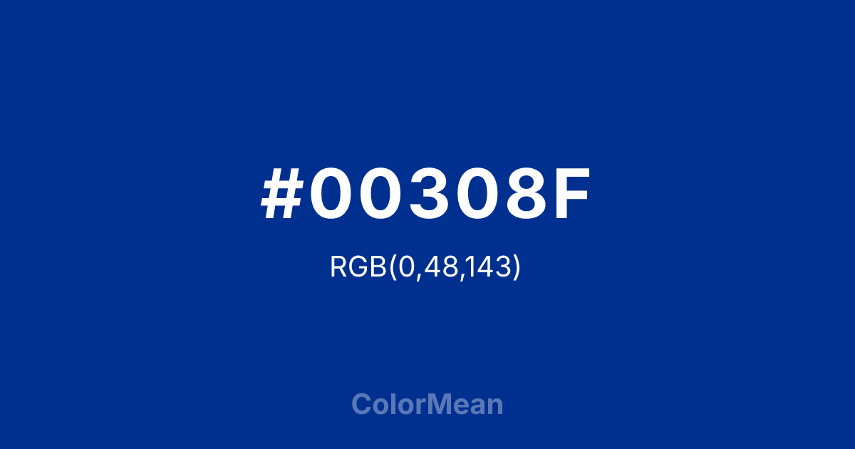 Air Force Blue (USAF) (#00308F) RGB value is (0, 48, 143). The hex color red value is 0, green is 48, and blue is 143. Its HSL format shows a hue of 220°, saturation of 100%, and lightness of 28%. The CMYK process values are 100%, 66%, 0%, 44%.
