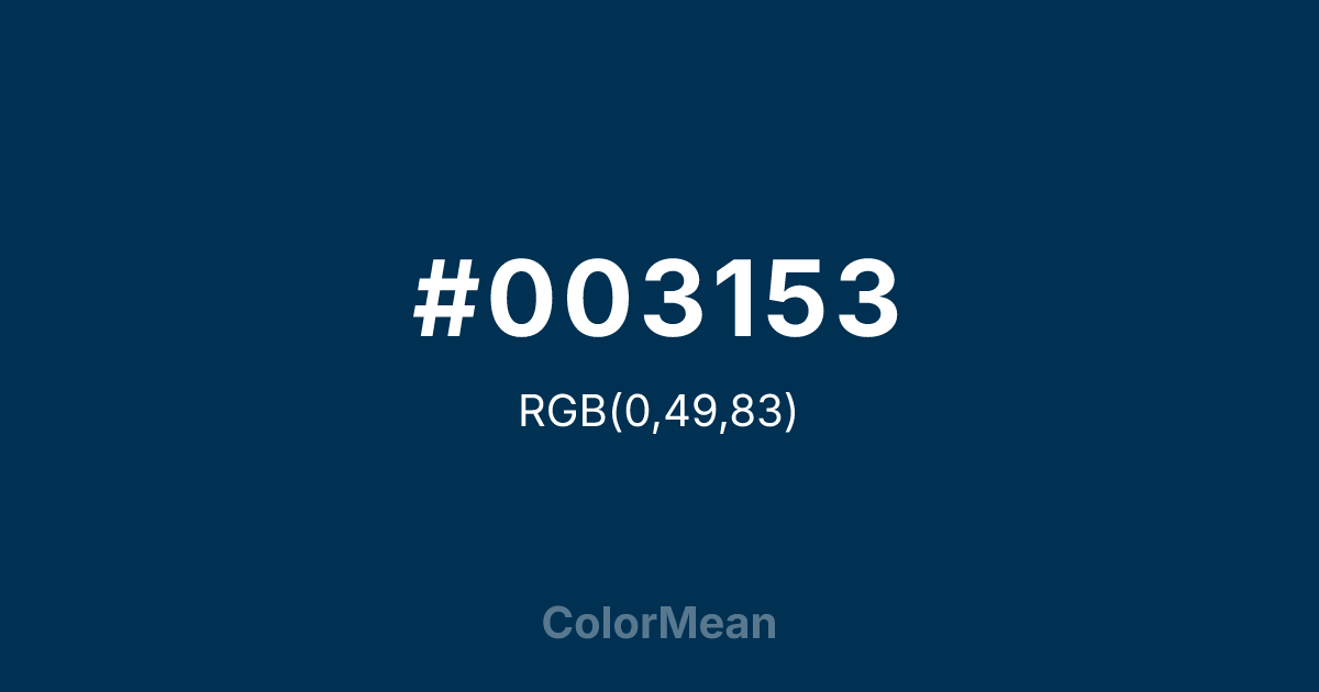 Prussian Blue (#003153) RGB value is (0, 49, 83). The hex color red value is 0, green is 49, and blue is 83. Its HSL format shows a hue of 205°, saturation of 100%, and lightness of 16%. The CMYK process values are 100%, 41%, 0%, 67%.