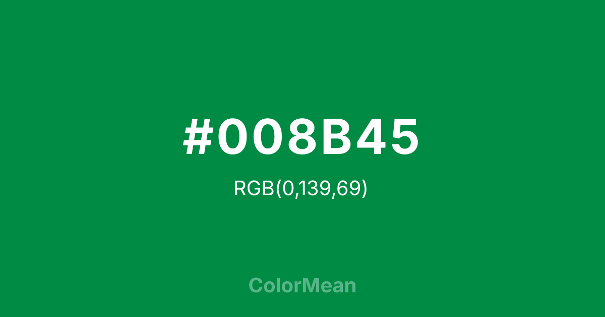 Spring Green 4 (#008B45) RGB value is (0, 139, 69). The hex color red value is 0, green is 139, and blue is 69. Its HSL format shows a hue of 150°, saturation of 100%, and lightness of 27%. The CMYK process values are 100%, 0%, 50%, 45%.