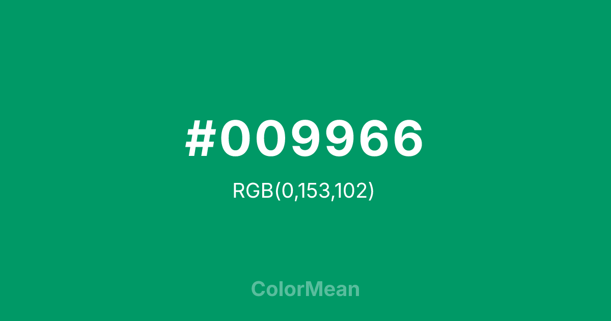 Green Cyan (#009966) RGB value is (0, 153, 102). The hex color red value is 0, green is 153, and blue is 102. Its HSL format shows a hue of 160°, saturation of 100%, and lightness of 30%. The CMYK process values are 100%, 0%, 33%, 40%.