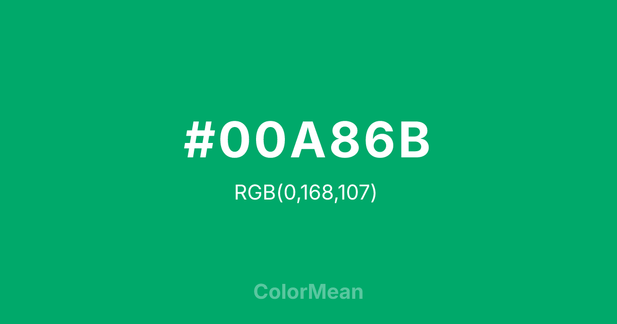 Jade (#00A86B) RGB value is (0, 168, 107). The hex color red value is 0, green is 168, and blue is 107. Its HSL format shows a hue of 158°, saturation of 100%, and lightness of 33%. The CMYK process values are 100%, 0%, 36%, 34%.