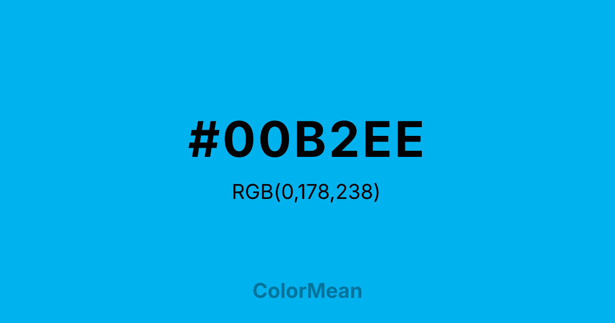 DeepSkyBlue2 (#00B2EE) RGB value is (0, 178, 238). The hex color red value is 0, green is 178, and blue is 238. Its HSL format shows a hue of 195°, saturation of 100%, and lightness of 47%. The CMYK process values are 100%, 25%, 0%, 7%.