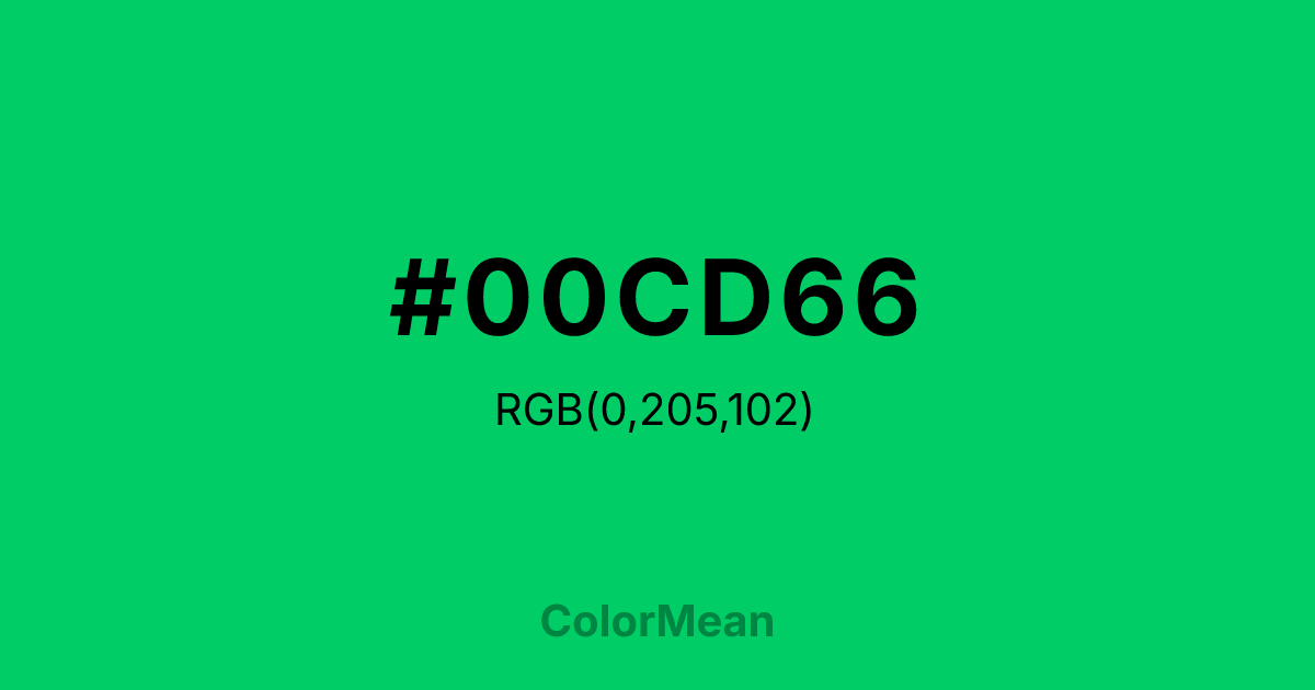 Spring Green 3 (#00CD66) RGB value is (0, 205, 102). The hex color red value is 0, green is 205, and blue is 102. Its HSL format shows a hue of 150°, saturation of 100%, and lightness of 40%. The CMYK process values are 100%, 0%, 50%, 20%.
