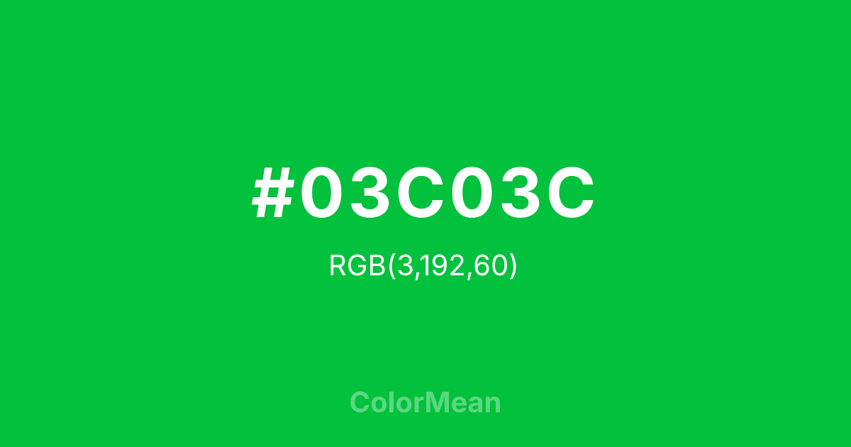 Dark Pastel Green (#03C03C) RGB value is (3, 192, 60). The hex color red value is 3, green is 192, and blue is 60. Its HSL format shows a hue of 138°, saturation of 97%, and lightness of 38%. The CMYK process values are 98%, 0%, 69%, 25%.
