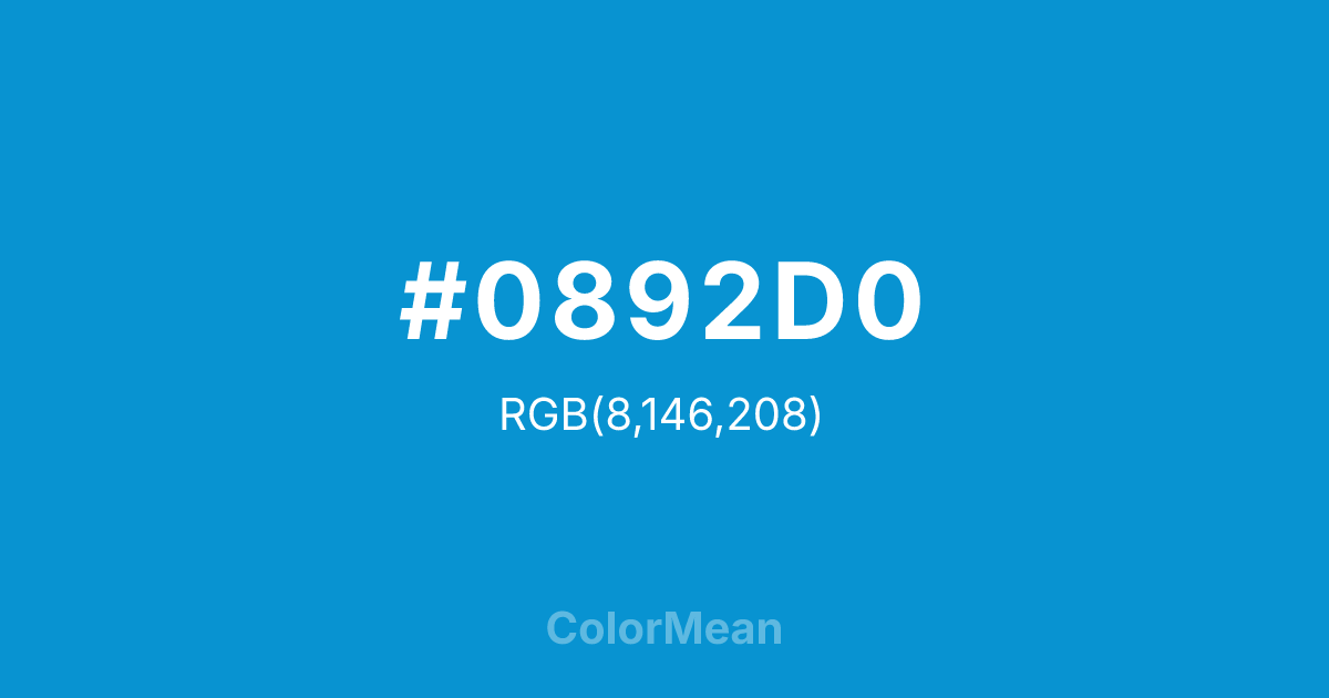 Rich Electric Blue (#0892D0) RGB value is (8, 146, 208). The hex color red value is 8, green is 146, and blue is 208. Its HSL format shows a hue of 199°, saturation of 93%, and lightness of 42%. The CMYK process values are 96%, 30%, 0%, 18%.