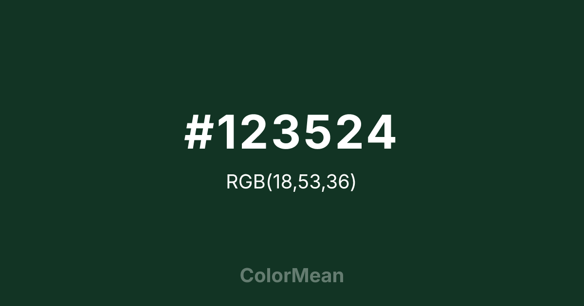 Phthalo Green (#123524) RGB value is (18, 53, 36). The hex color red value is 18, green is 53, and blue is 36. Its HSL format shows a hue of 151°, saturation of 49%, and lightness of 14%. The CMYK process values are 66%, 0%, 32%, 79%.