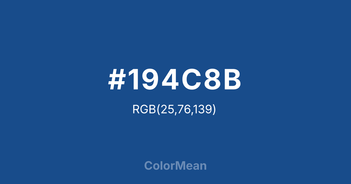 Classic Blue (#194C8B) RGB value is (25, 76, 139). The hex color red value is 25, green is 76, and blue is 139. Its HSL format shows a hue of 213°, saturation of 70%, and lightness of 32%. The CMYK process values are 82%, 45%, 0%, 45%.