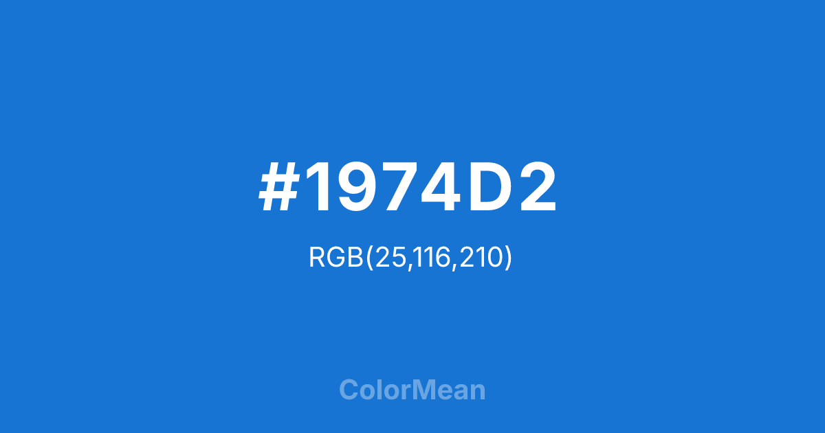 Bright Navy Blue (#1974D2) RGB value is (25, 116, 210). The hex color red value is 25, green is 116, and blue is 210. Its HSL format shows a hue of 210°, saturation of 79%, and lightness of 46%. The CMYK process values are 88%, 45%, 0%, 18%.