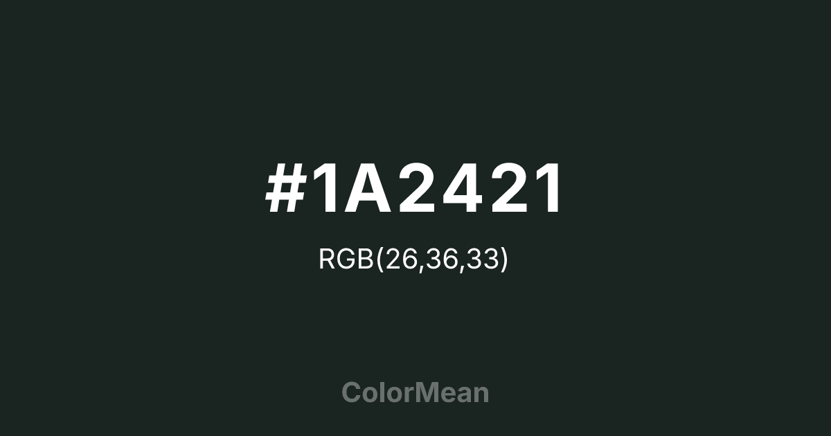 Dark Jungle Green (#1A2421) RGB value is (26, 36, 33). The hex color red value is 26, green is 36, and blue is 33. Its HSL format shows a hue of 162°, saturation of 16%, and lightness of 12%. The CMYK process values are 28%, 0%, 8%, 86%.