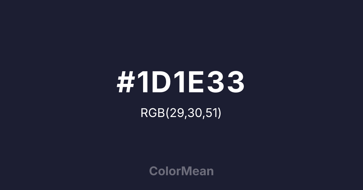 Saphire Blue (#1D1E33) RGB value is (29, 30, 51). The hex color red value is 29, green is 30, and blue is 51. Its HSL format shows a hue of 237°, saturation of 28%, and lightness of 16%. The CMYK process values are 43%, 41%, 0%, 80%.