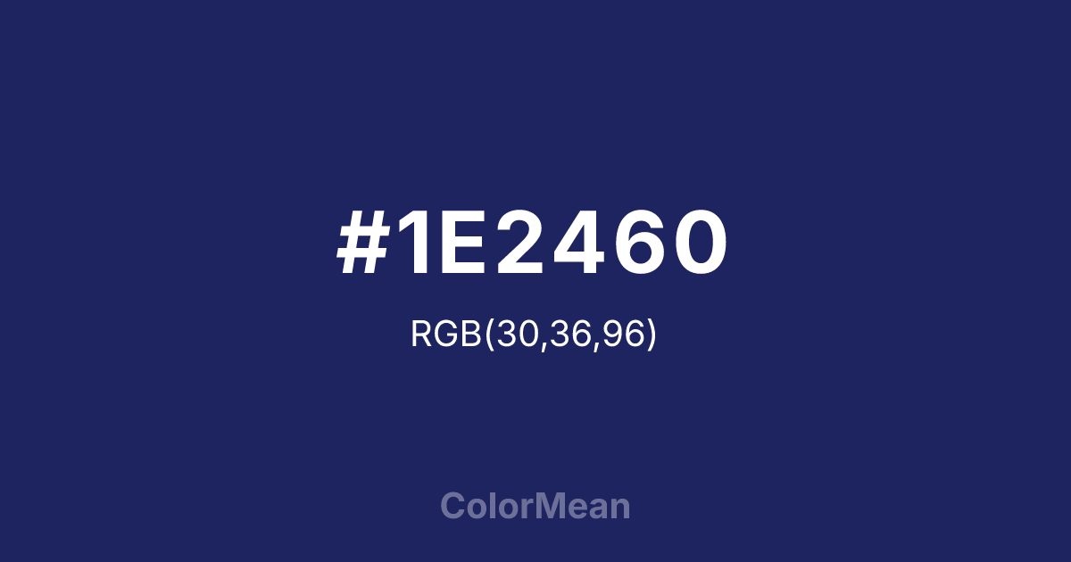 Signal Blue (#1E2460) RGB value is (30, 36, 96). The hex color red value is 30, green is 36, and blue is 96. Its HSL format shows a hue of 235°, saturation of 52%, and lightness of 25%. The CMYK process values are 69%, 63%, 0%, 62%.