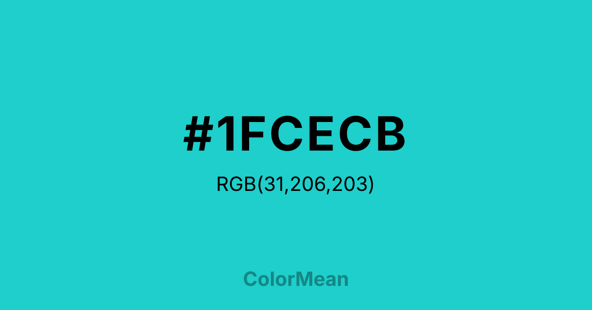 Robins Egg Blue 1 (#1FCECB) RGB value is (31, 206, 203). The hex color red value is 31, green is 206, and blue is 203. Its HSL format shows a hue of 179°, saturation of 74%, and lightness of 46%. The CMYK process values are 85%, 0%, 1%, 19%.