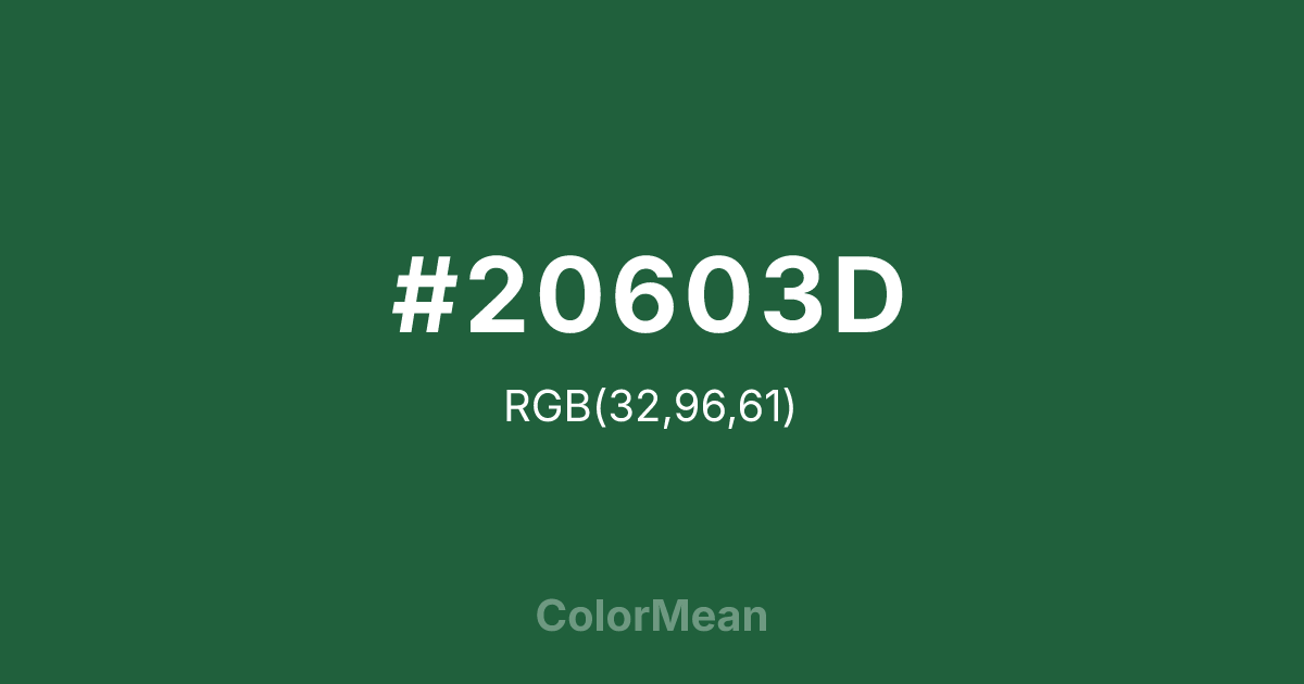 Mint Green (#20603D) RGB value is (32, 96, 61). The hex color red value is 32, green is 96, and blue is 61. Its HSL format shows a hue of 147°, saturation of 50%, and lightness of 25%. The CMYK process values are 67%, 0%, 36%, 62%.
