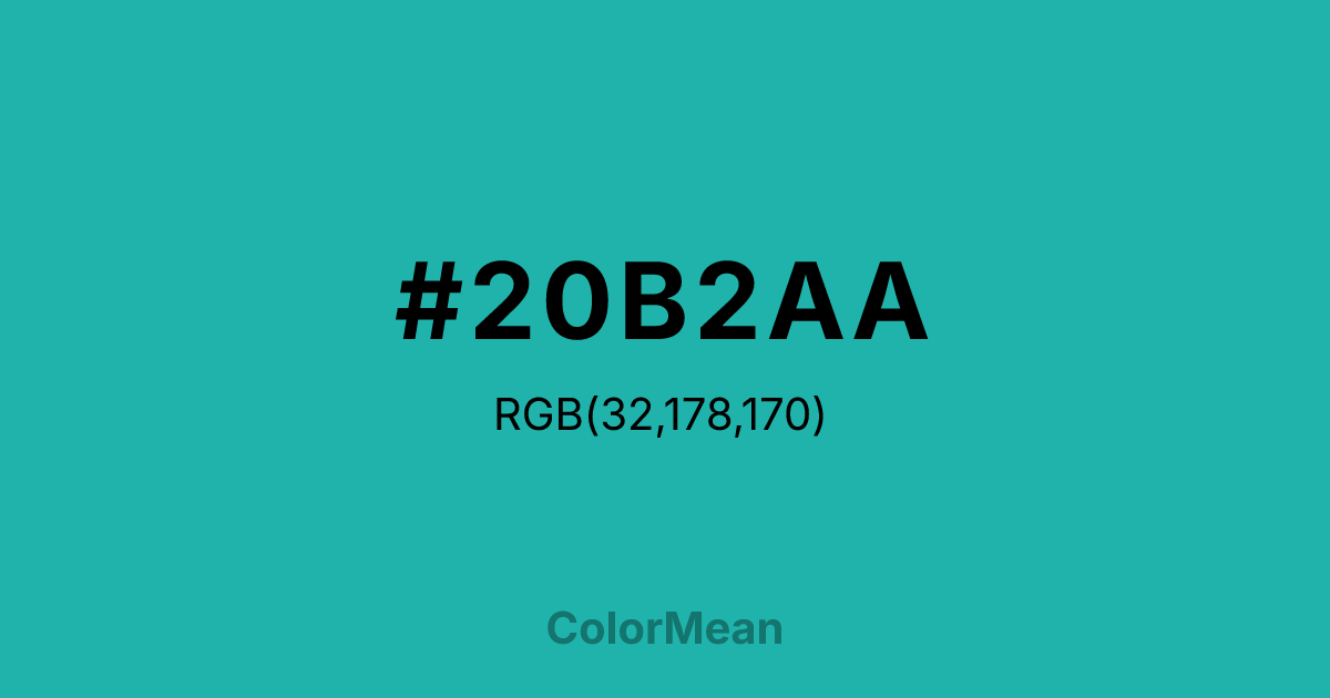 LightseaGreen (#20B2AA) RGB value is (32, 178, 170). The hex color red value is 32, green is 178, and blue is 170. Its HSL format shows a hue of 177°, saturation of 70%, and lightness of 41%. The CMYK process values are 82%, 0%, 4%, 30%.