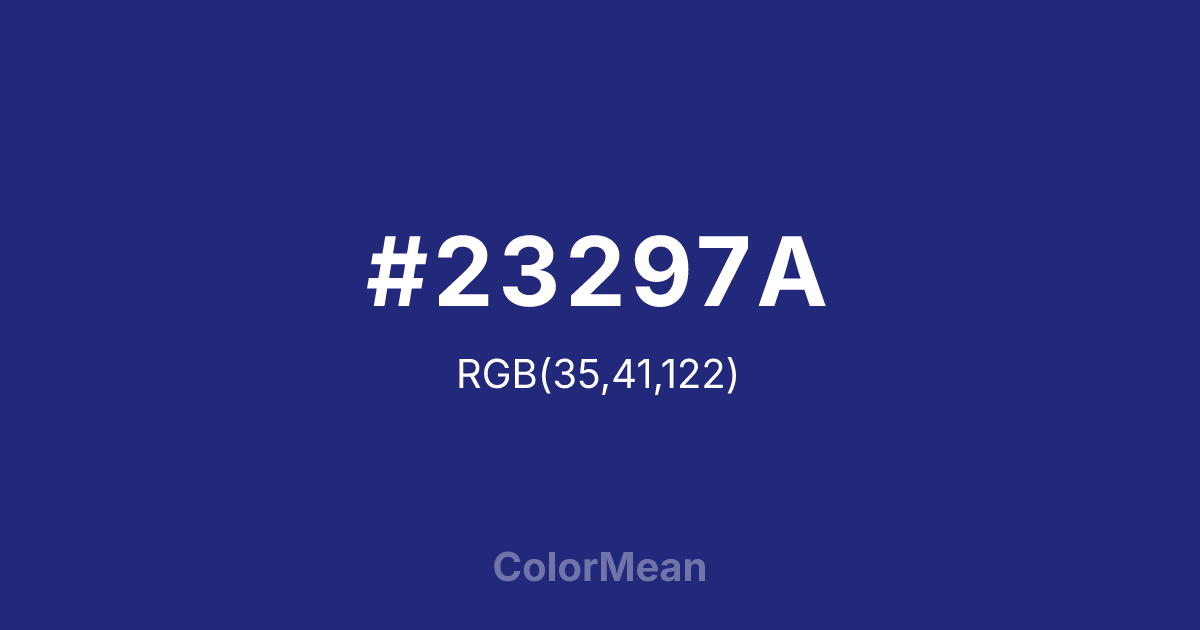 St. Patricks Blue (#23297A) RGB value is (35, 41, 122). The hex color red value is 35, green is 41, and blue is 122. Its HSL format shows a hue of 236°, saturation of 55%, and lightness of 31%. The CMYK process values are 71%, 66%, 0%, 52%.