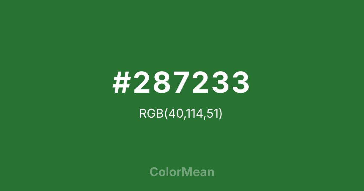 Emerald Green (#287233) RGB value is (40, 114, 51). The hex color red value is 40, green is 114, and blue is 51. Its HSL format shows a hue of 129°, saturation of 48%, and lightness of 30%. The CMYK process values are 65%, 0%, 55%, 55%.