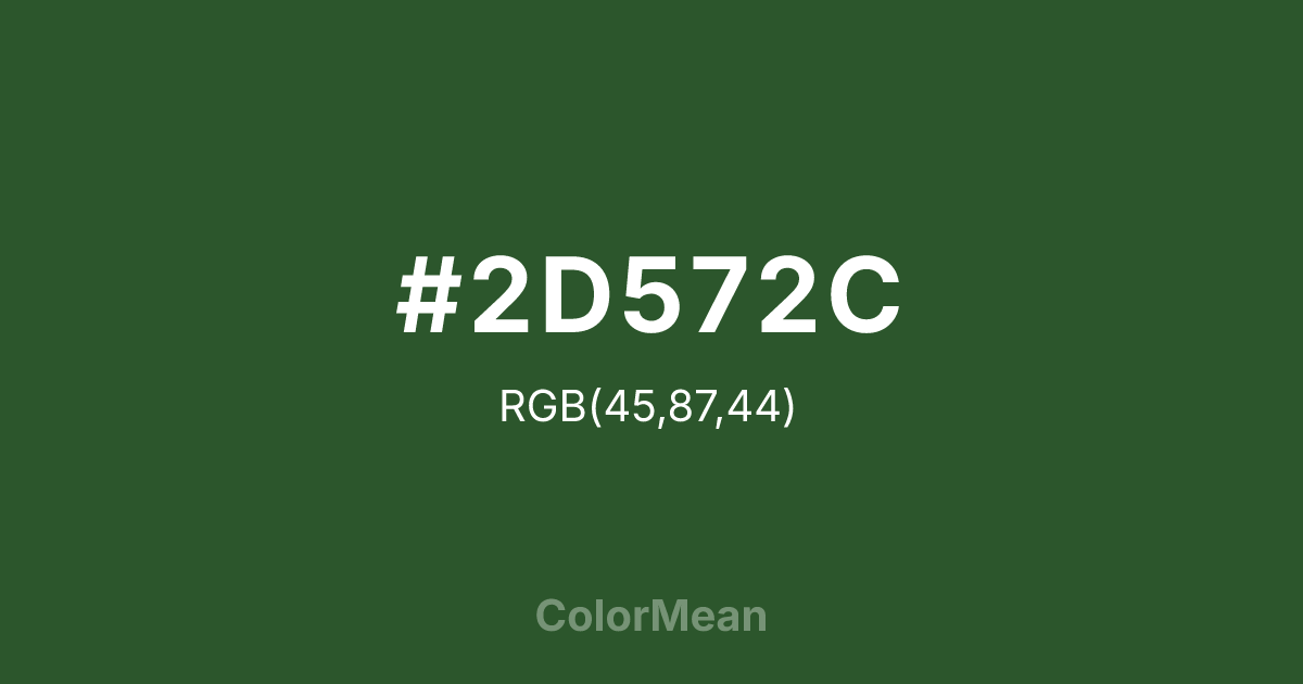 Leaf Green (#2D572C) RGB value is (45, 87, 44). The hex color red value is 45, green is 87, and blue is 44. Its HSL format shows a hue of 119°, saturation of 33%, and lightness of 26%. The CMYK process values are 48%, 0%, 49%, 66%.