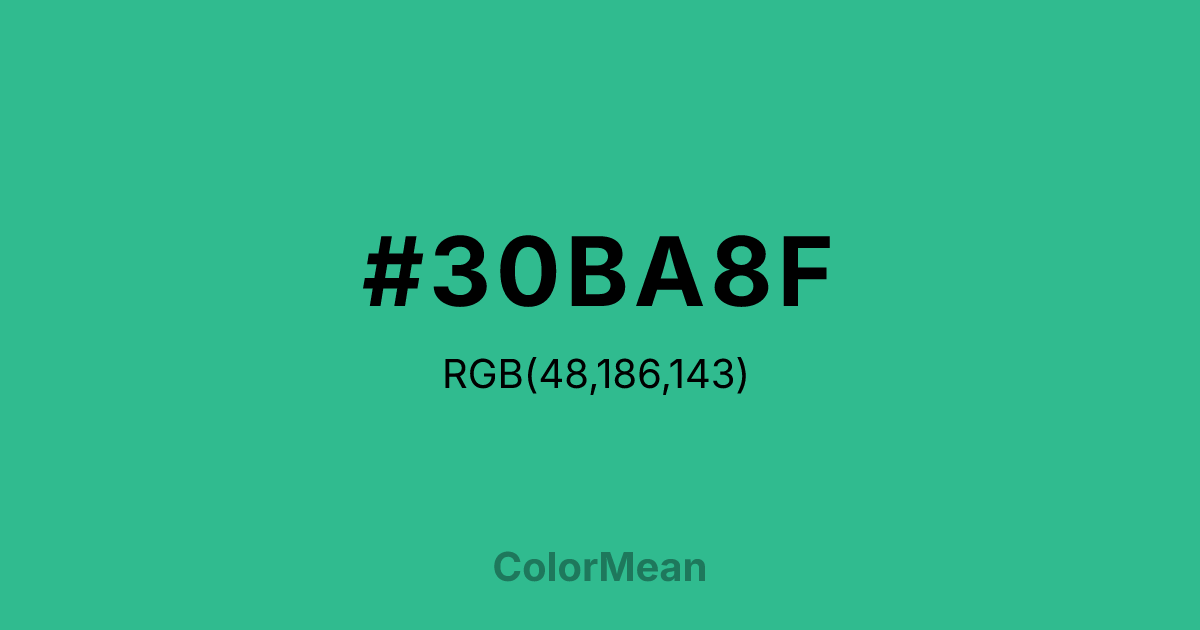 Mountain Meadow (#30BA8F) RGB value is (48, 186, 143). The hex color red value is 48, green is 186, and blue is 143. Its HSL format shows a hue of 161°, saturation of 59%, and lightness of 46%. The CMYK process values are 74%, 0%, 23%, 27%.