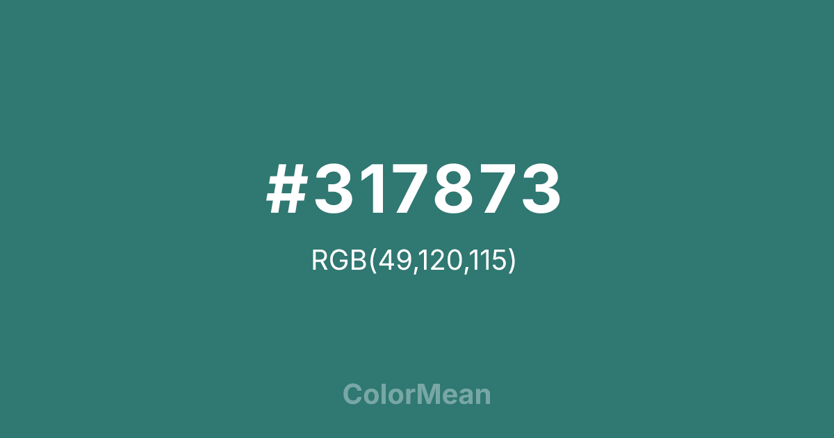 Myrtle Green (#317873) RGB value is (49, 120, 115). The hex color red value is 49, green is 120, and blue is 115. Its HSL format shows a hue of 176°, saturation of 42%, and lightness of 33%. The CMYK process values are 59%, 0%, 4%, 53%.