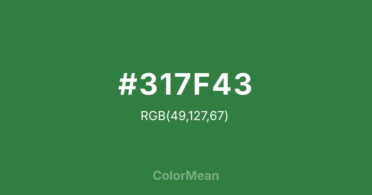 Signal Green (#317F43) RGB value is (49, 127, 67). The hex color red value is 49, green is 127, and blue is 67. Its HSL format shows a hue of 134°, saturation of 44%, and lightness of 35%. The CMYK process values are 61%, 0%, 47%, 50%.