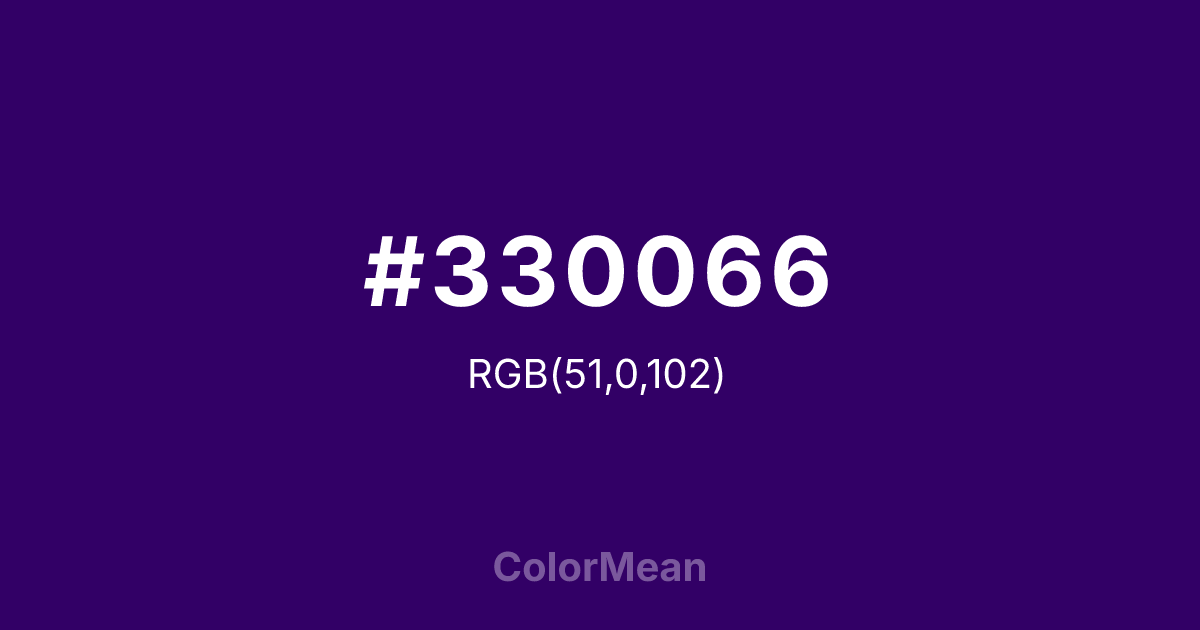 Deep Violet (#330066) RGB value is (51, 0, 102). The hex color red value is 51, green is 0, and blue is 102. Its HSL format shows a hue of 270°, saturation of 100%, and lightness of 20%. The CMYK process values are 50%, 100%, 0%, 60%.