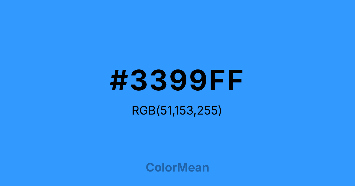 Brilliant Azure (#3399FF) RGB value is (51, 153, 255). The hex color red value is 51, green is 153, and blue is 255. Its HSL format shows a hue of 210°, saturation of 100%, and lightness of 60%. The CMYK process values are 80%, 40%, 0%, 0%.