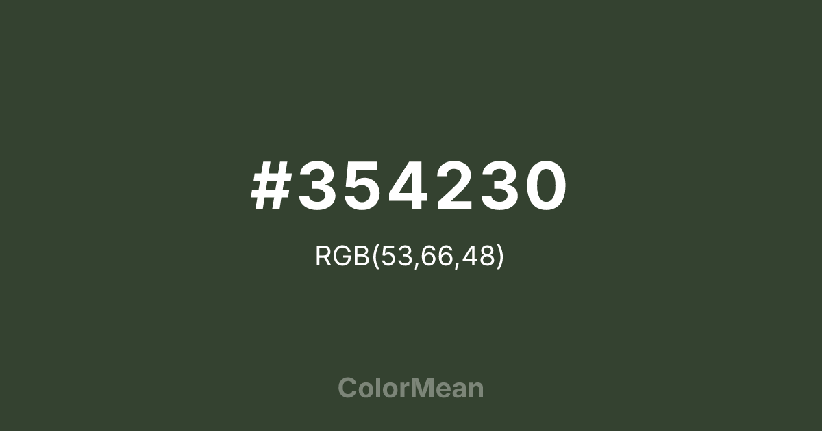 Kombu Green (#354230) RGB value is (53, 66, 48). The hex color red value is 53, green is 66, and blue is 48. Its HSL format shows a hue of 103°, saturation of 16%, and lightness of 22%. The CMYK process values are 20%, 0%, 27%, 74%.