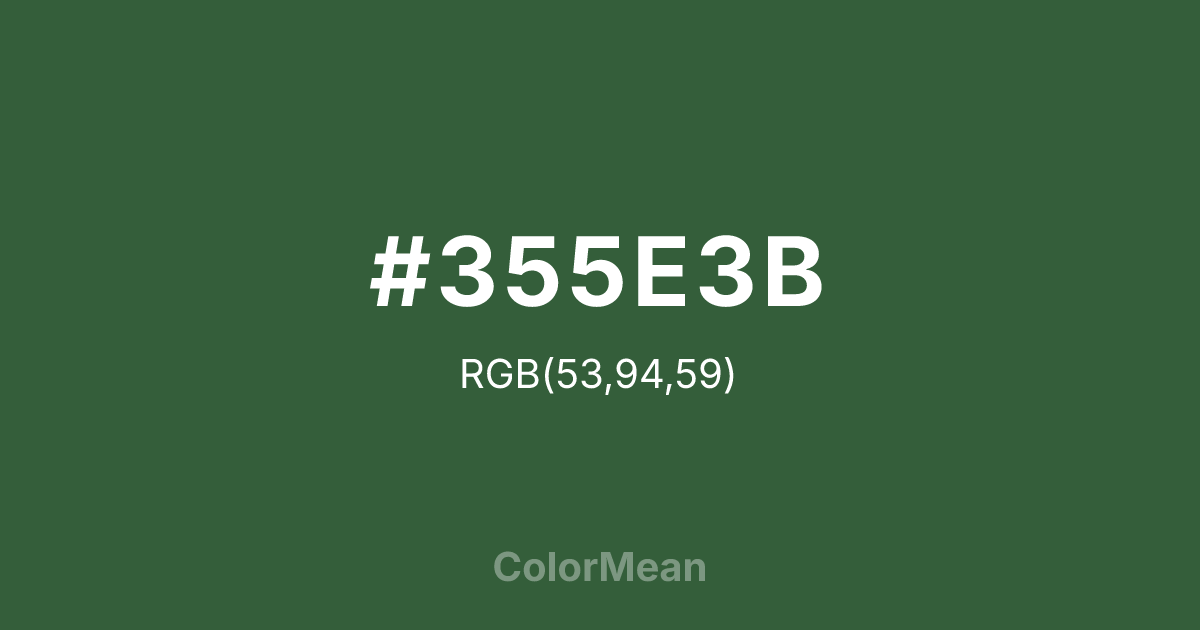 Hunter Green (#355E3B) RGB value is (53, 94, 59). The hex color red value is 53, green is 94, and blue is 59. Its HSL format shows a hue of 129°, saturation of 28%, and lightness of 29%. The CMYK process values are 44%, 0%, 37%, 63%.