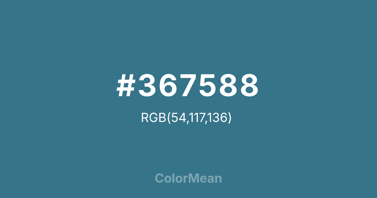 Teal Blue (#367588) RGB value is (54, 117, 136). The hex color red value is 54, green is 117, and blue is 136. Its HSL format shows a hue of 194°, saturation of 43%, and lightness of 37%. The CMYK process values are 60%, 14%, 0%, 47%.