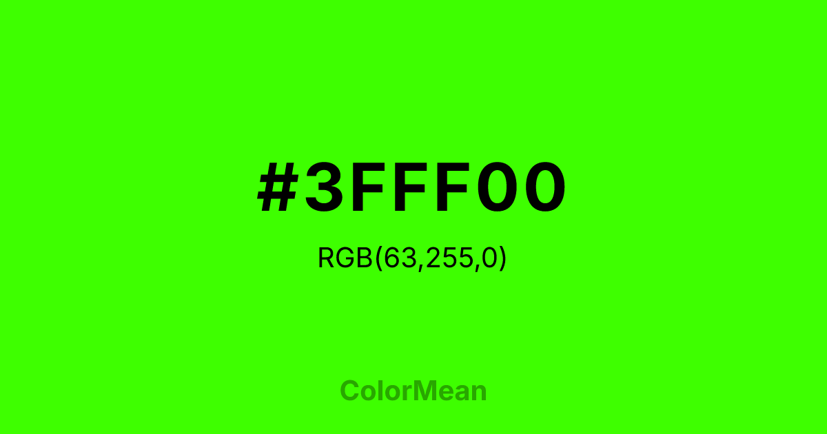 Harlequin (#3FFF00) RGB value is (63, 255, 0). The hex color red value is 63, green is 255, and blue is 0. Its HSL format shows a hue of 105°, saturation of 100%, and lightness of 50%. The CMYK process values are 75%, 0%, 100%, 0%.