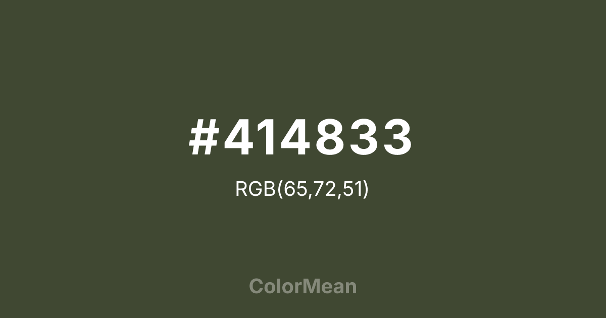 Rifle Green (#414833) RGB value is (65, 72, 51). The hex color red value is 65, green is 72, and blue is 51. Its HSL format shows a hue of 80°, saturation of 17%, and lightness of 24%. The CMYK process values are 10%, 0%, 29%, 72%.