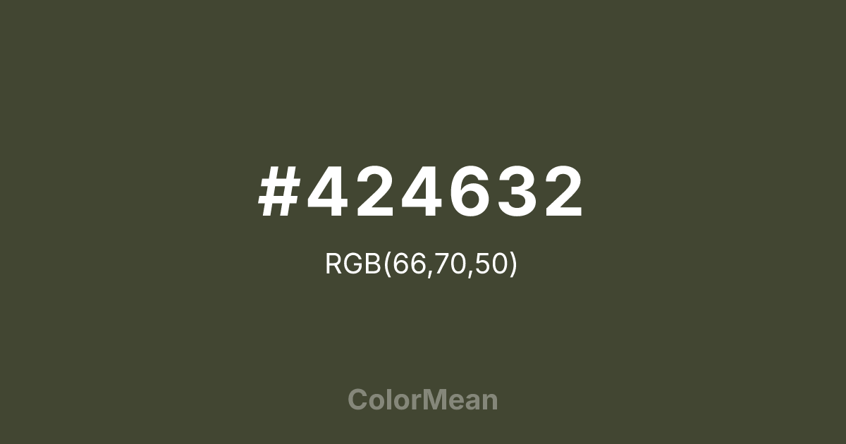 Olive Green (#424632) RGB value is (66, 70, 50). The hex color red value is 66, green is 70, and blue is 50. Its HSL format shows a hue of 72°, saturation of 17%, and lightness of 24%. The CMYK process values are 6%, 0%, 29%, 73%.