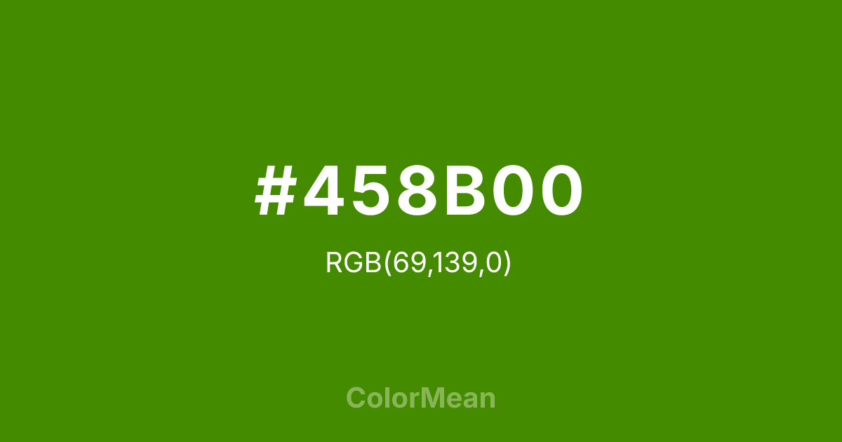 Chartreuse4 (#458B00) RGB value is (69, 139, 0). The hex color red value is 69, green is 139, and blue is 0. Its HSL format shows a hue of 90°, saturation of 100%, and lightness of 27%. The CMYK process values are 50%, 0%, 100%, 45%.