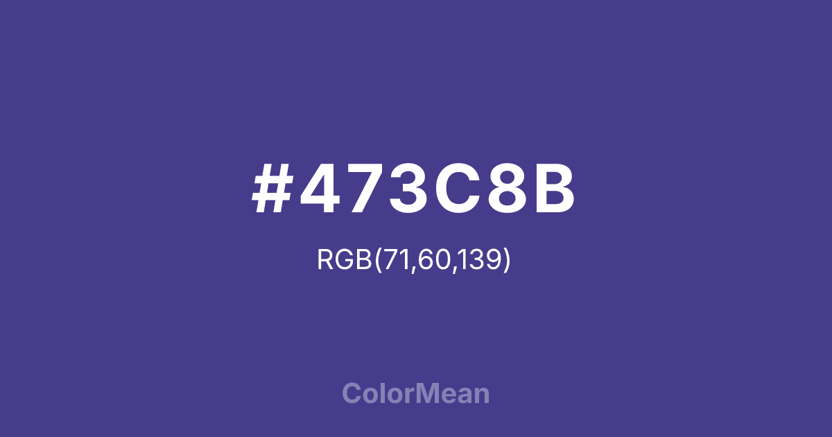 Slate Blue 4 (#473C8B) RGB value is (71, 60, 139). The hex color red value is 71, green is 60, and blue is 139. Its HSL format shows a hue of 248°, saturation of 40%, and lightness of 39%. The CMYK process values are 49%, 57%, 0%, 45%.