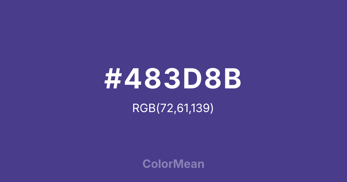 DarkslateBlue (#483D8B) RGB value is (72, 61, 139). The hex color red value is 72, green is 61, and blue is 139. Its HSL format shows a hue of 248°, saturation of 39%, and lightness of 39%. The CMYK process values are 48%, 56%, 0%, 45%.