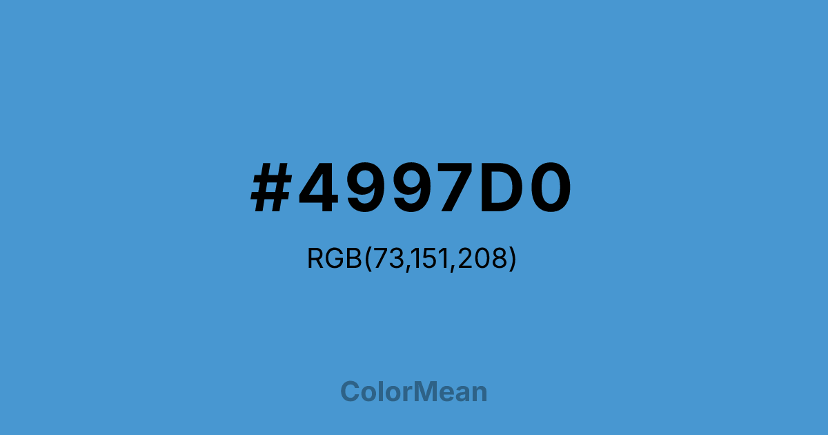 Celestial Blue (#4997D0) RGB value is (73, 151, 208). The hex color red value is 73, green is 151, and blue is 208. Its HSL format shows a hue of 205°, saturation of 59%, and lightness of 55%. The CMYK process values are 65%, 27%, 0%, 18%.