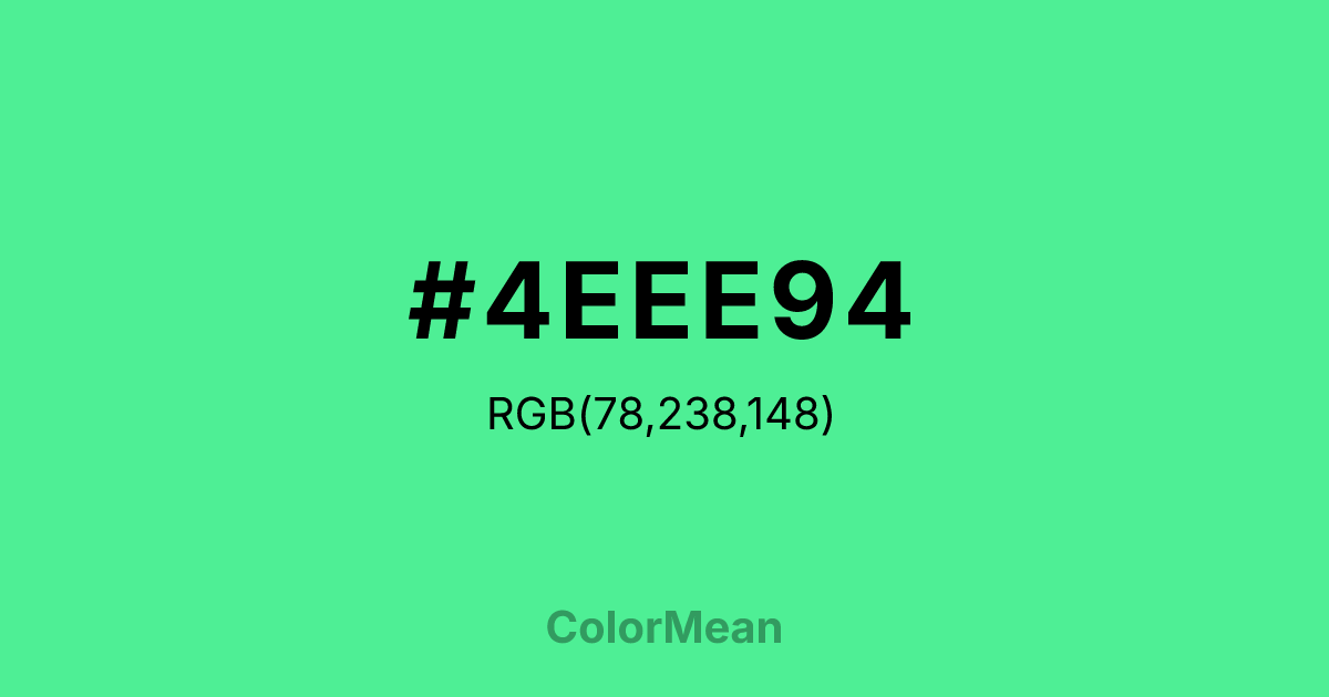 Sea Green 2 (#4EEE94) RGB value is (78, 238, 148). The hex color red value is 78, green is 238, and blue is 148. Its HSL format shows a hue of 146°, saturation of 82%, and lightness of 62%. The CMYK process values are 67%, 0%, 38%, 7%.
