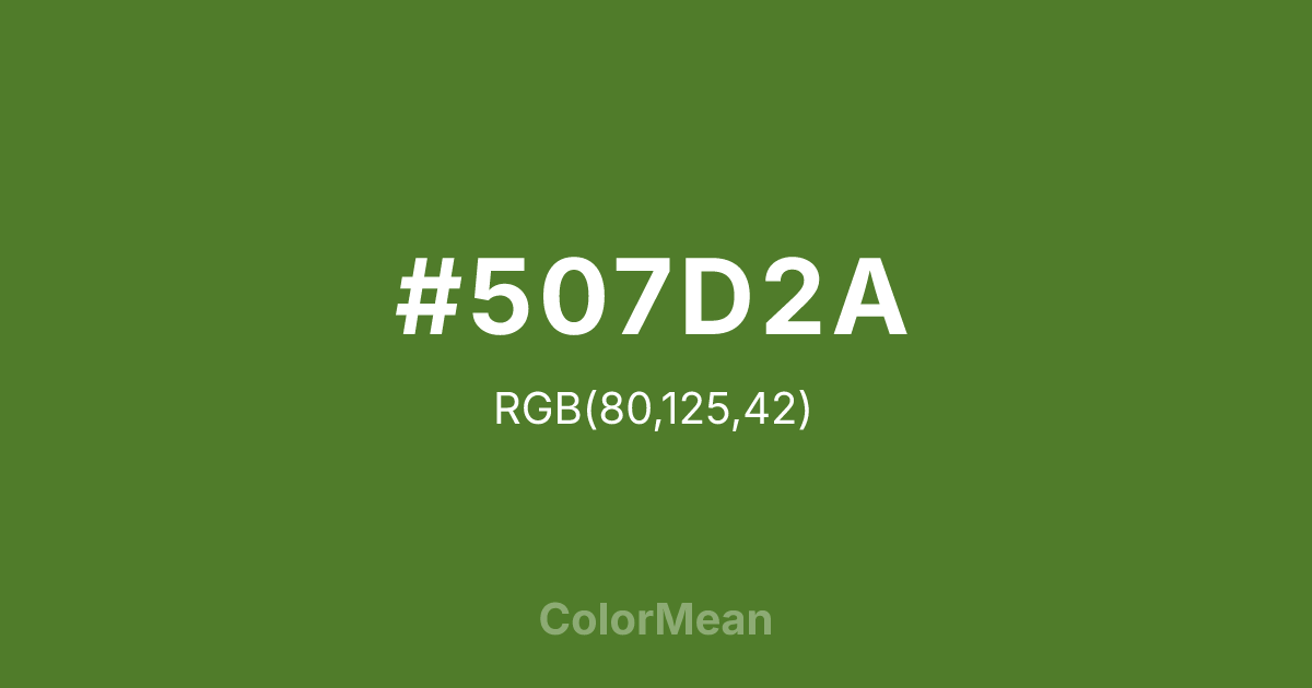 Sap Green (#507D2A) RGB value is (80, 125, 42). The hex color red value is 80, green is 125, and blue is 42. Its HSL format shows a hue of 93°, saturation of 50%, and lightness of 33%. The CMYK process values are 36%, 0%, 66%, 51%.