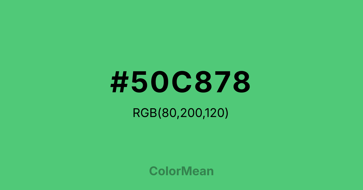 Paris Green (#50C878) RGB value is (80, 200, 120). The hex color red value is 80, green is 200, and blue is 120. Its HSL format shows a hue of 140°, saturation of 52%, and lightness of 55%. The CMYK process values are 60%, 0%, 40%, 22%.