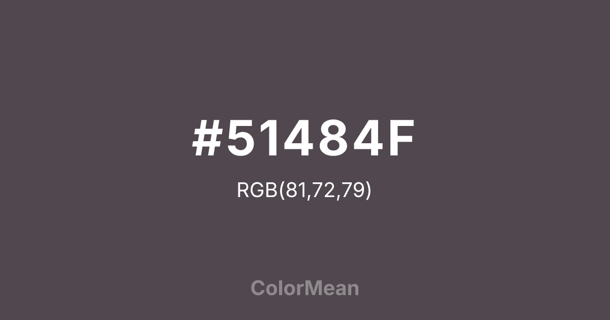 Quartz (#51484F) RGB value is (81, 72, 79). The hex color red value is 81, green is 72, and blue is 79. Its HSL format shows a hue of 313°, saturation of 6%, and lightness of 30%. The CMYK process values are 0%, 11%, 2%, 68%.