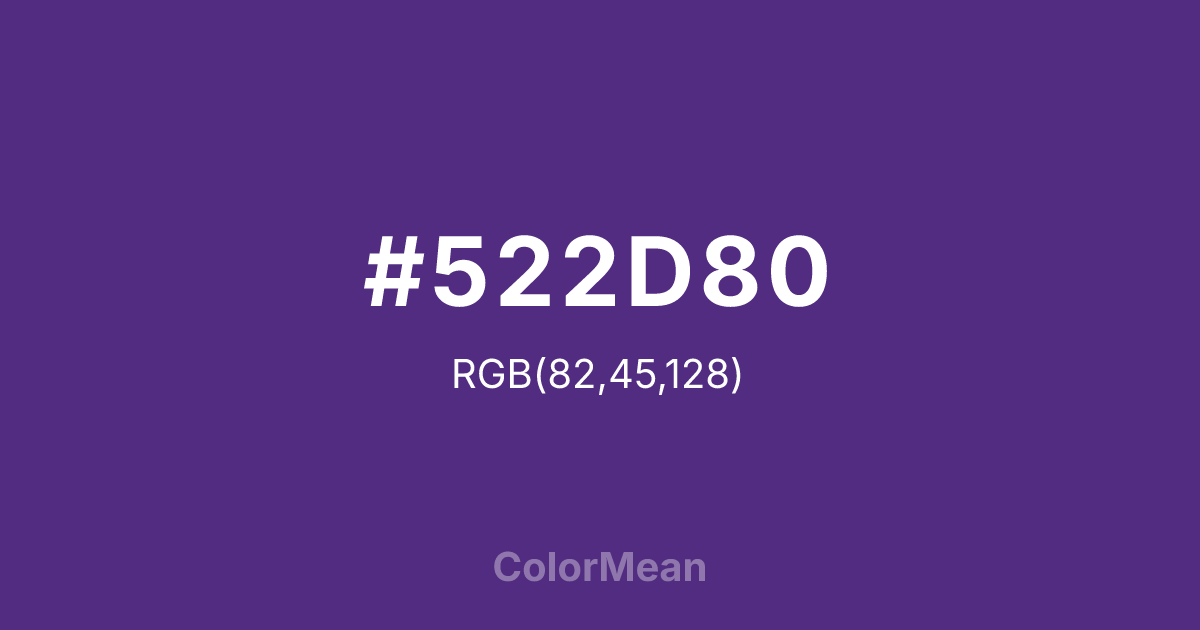 Regalia (#522D80) RGB value is (82, 45, 128). The hex color red value is 82, green is 45, and blue is 128. Its HSL format shows a hue of 267°, saturation of 48%, and lightness of 34%. The CMYK process values are 36%, 65%, 0%, 50%.