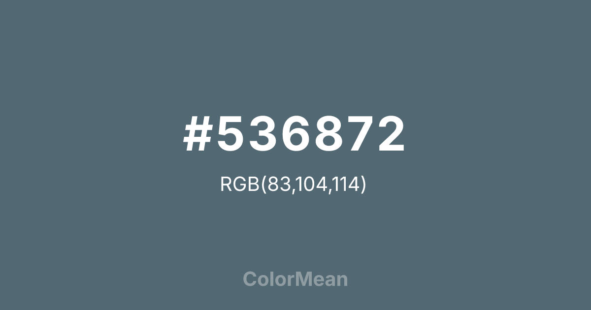 Cadet (#536872) RGB value is (83, 104, 114). The hex color red value is 83, green is 104, and blue is 114. Its HSL format shows a hue of 199°, saturation of 16%, and lightness of 39%. The CMYK process values are 27%, 9%, 0%, 55%.