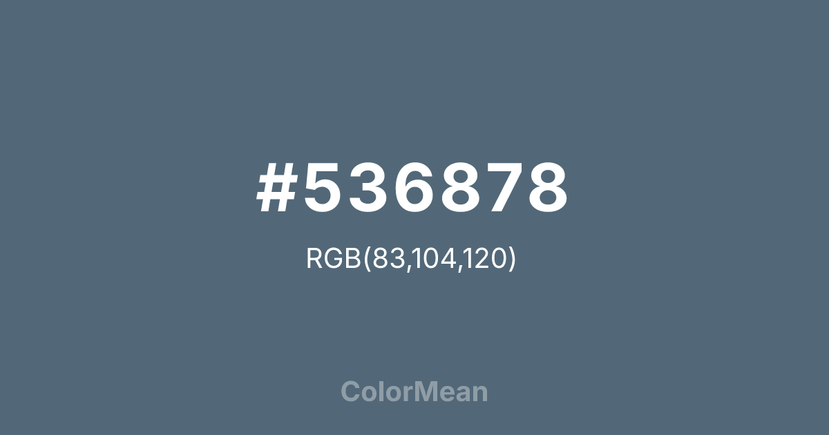 Payne Grey (#536878) RGB value is (83, 104, 120). The hex color red value is 83, green is 104, and blue is 120. Its HSL format shows a hue of 206°, saturation of 18%, and lightness of 40%. The CMYK process values are 31%, 13%, 0%, 53%.