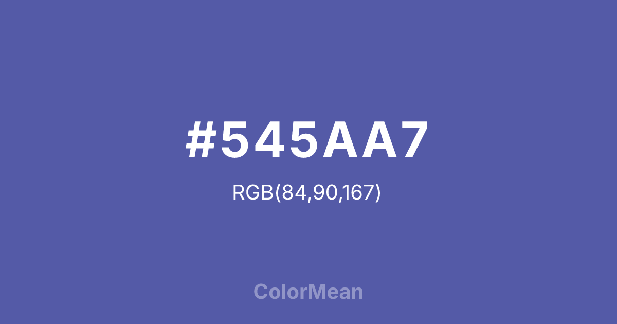 Liberty (#545AA7) RGB value is (84, 90, 167). The hex color red value is 84, green is 90, and blue is 167. Its HSL format shows a hue of 236°, saturation of 33%, and lightness of 49%. The CMYK process values are 50%, 46%, 0%, 35%.