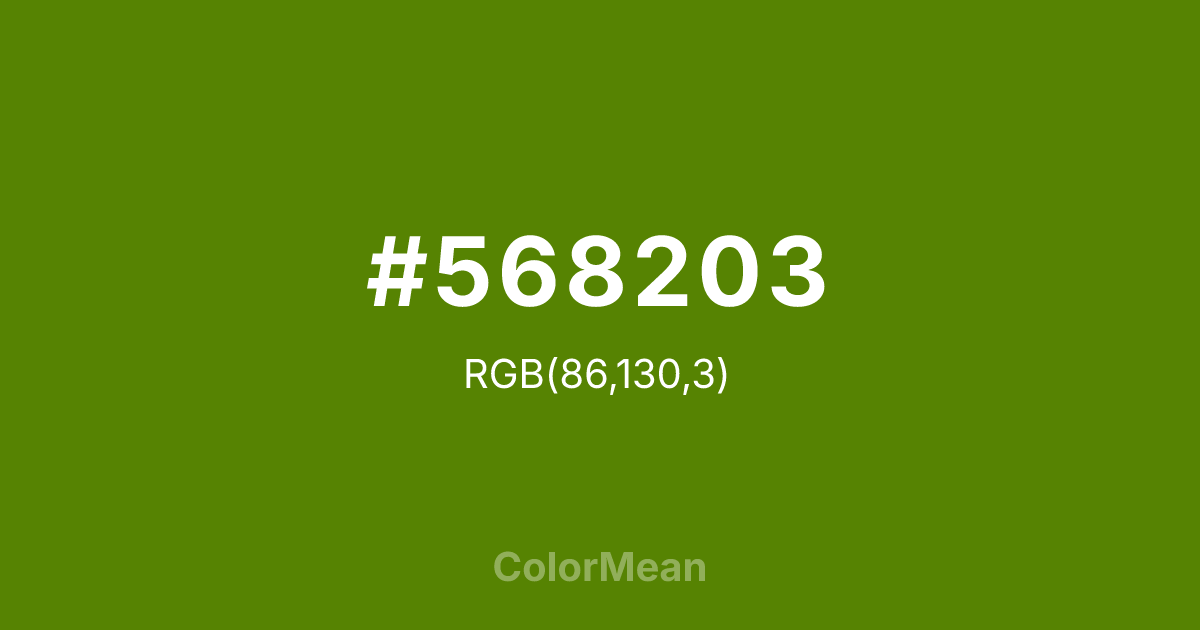 Avocado (#568203) RGB value is (86, 130, 3). The hex color red value is 86, green is 130, and blue is 3. Its HSL format shows a hue of 81°, saturation of 95%, and lightness of 26%. The CMYK process values are 34%, 0%, 98%, 49%.
