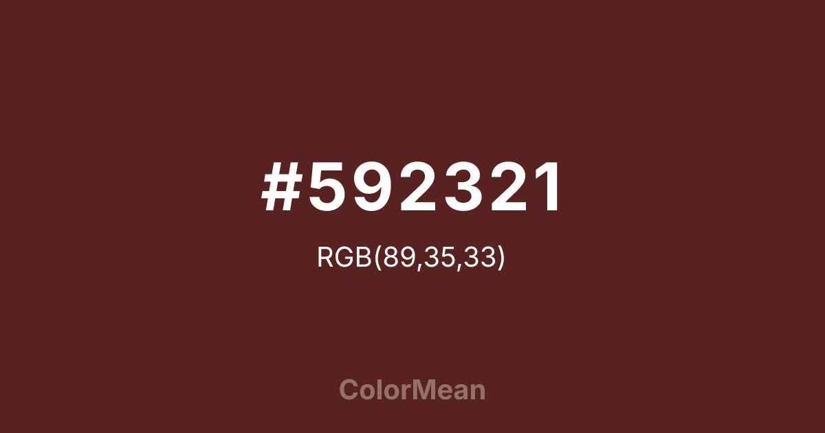 Red Brown (#592321) RGB value is (89, 35, 33). The hex color red value is 89, green is 35, and blue is 33. Its HSL format shows a hue of 2°, saturation of 46%, and lightness of 24%. The CMYK process values are 0%, 61%, 63%, 65%.