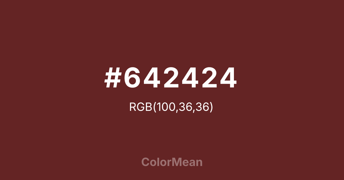 Oxide Red (#642424) RGB value is (100, 36, 36). The hex color red value is 100, green is 36, and blue is 36. Its HSL format shows a hue of 0°, saturation of 47%, and lightness of 27%. The CMYK process values are 0%, 64%, 64%, 61%.
