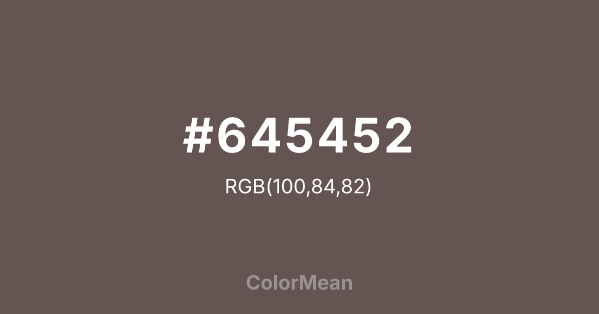 Wenge (#645452) RGB value is (100, 84, 82). The hex color red value is 100, green is 84, and blue is 82. Its HSL format shows a hue of 7°, saturation of 10%, and lightness of 36%. The CMYK process values are 0%, 16%, 18%, 61%.