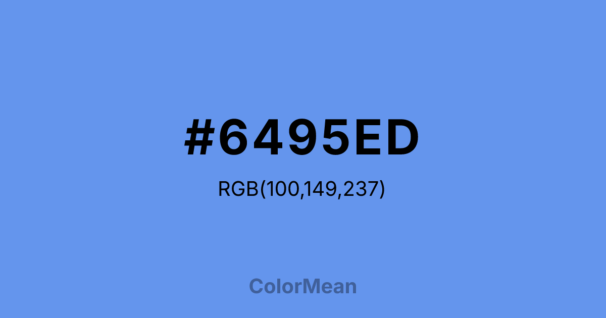 Cornflower (#6495ED) RGB value is (100, 149, 237). The hex color red value is 100, green is 149, and blue is 237. Its HSL format shows a hue of 219°, saturation of 79%, and lightness of 66%. The CMYK process values are 58%, 37%, 0%, 7%.